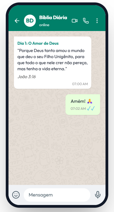 Simples! Todo dia você recebe 2 mensagens no WhatsApp: uma às 7h da manhã com 1 leitura bíblica + 1 devocional, e outra às 21h da noite com 1 oração de prosperidade. É só ler, refletir e orar. Leva uns minutinhos e transforma seu dia!
